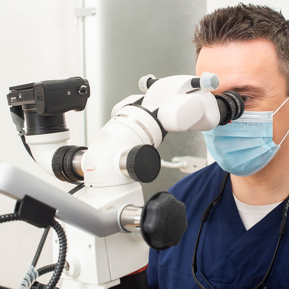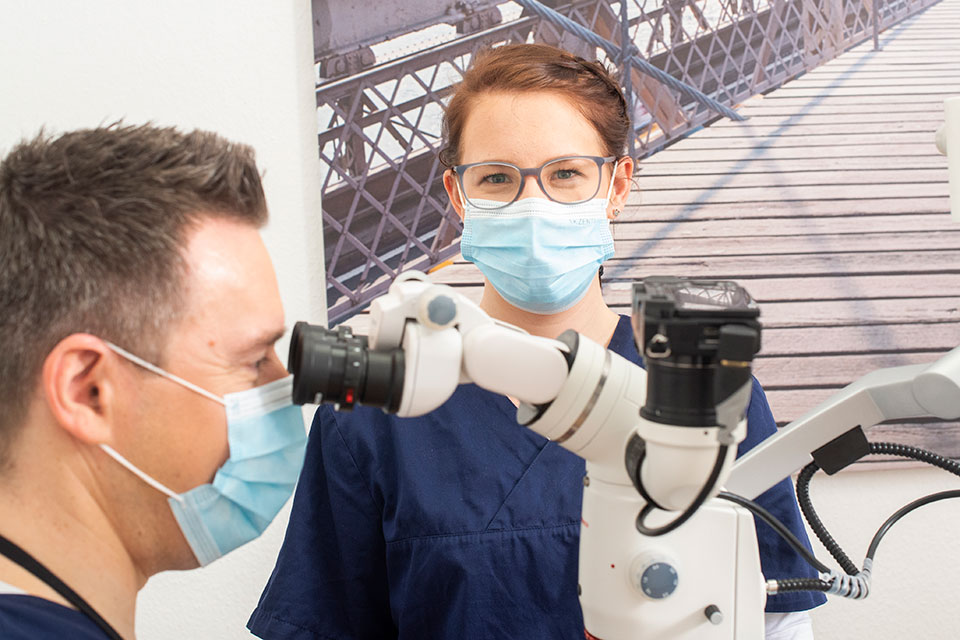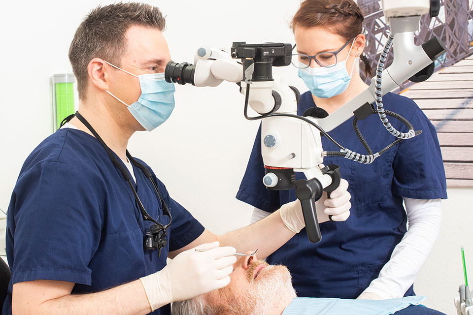 Deshalb arbeitet Dr. Plantus unter Sicht durchs OP-Mikroskop, um dabei den Fortschritt bei der Aufbereitung und Reinigung der Wurzelkanäle zu kontrollieren. Dank moderner Technik können heute Behandlungsergebnisse erzielt werden, die so vor wenigen Jahren nicht zu realisieren waren.