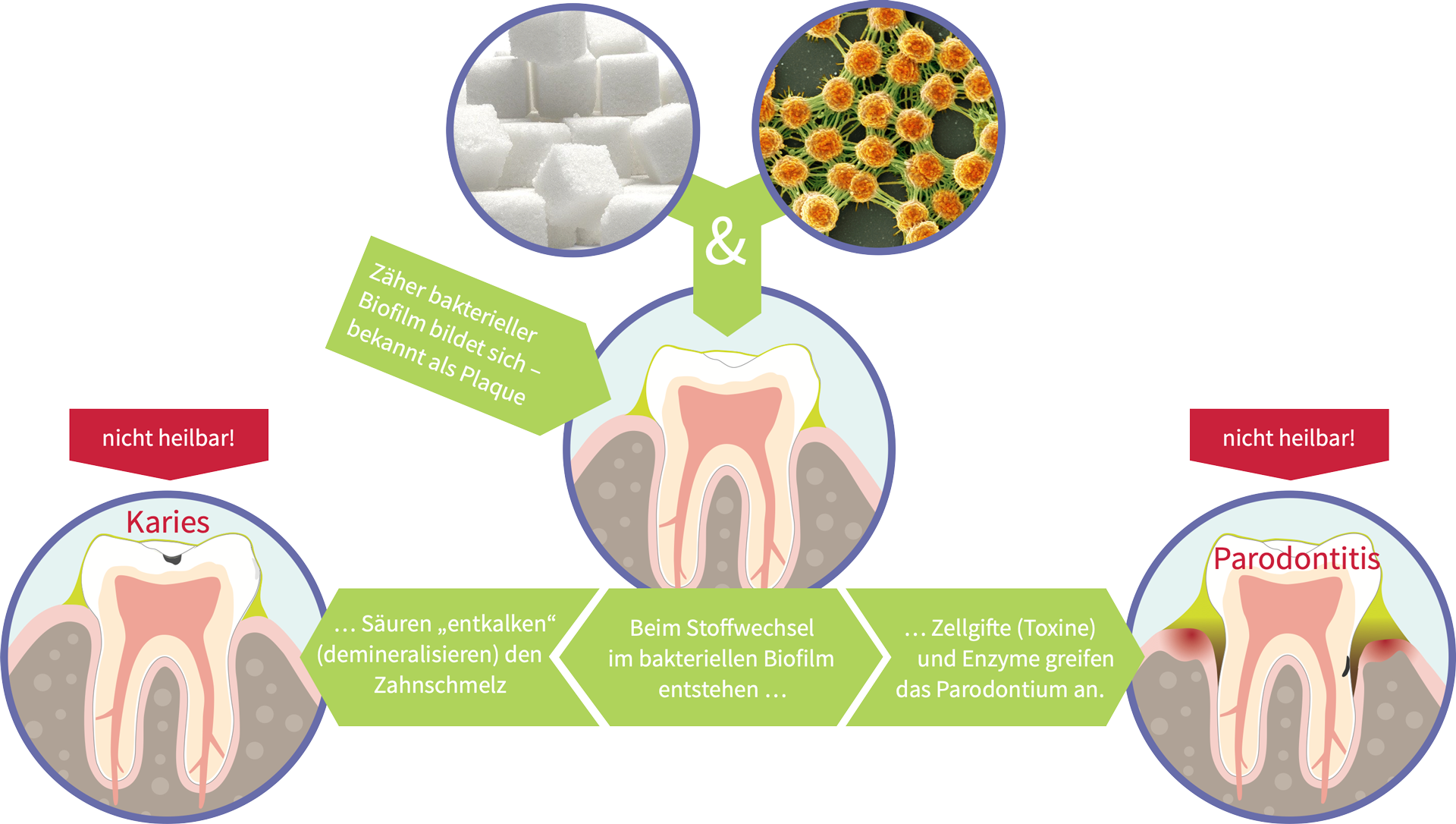 Säuren lösen Mineralien aus dem Zahnschmelz (De-Mineralisierung) und weichen ihn regelrecht auf. Zwar könnten sich Mineralien, die im Speichel enthalten sind, wieder im Zahnschmelz einlagern und so die entstandenen Schäden auf natürlichem Wege reparieren (Re-Mineralisierung), doch der dichte, zähe Biofilm auf der Zahnoberfläche verhindert dies. Deshalb dringen die Schmelzauflösungen immer tiefer in die Zahnoberfläche und bildet „Löcher“: Karies entsteht!