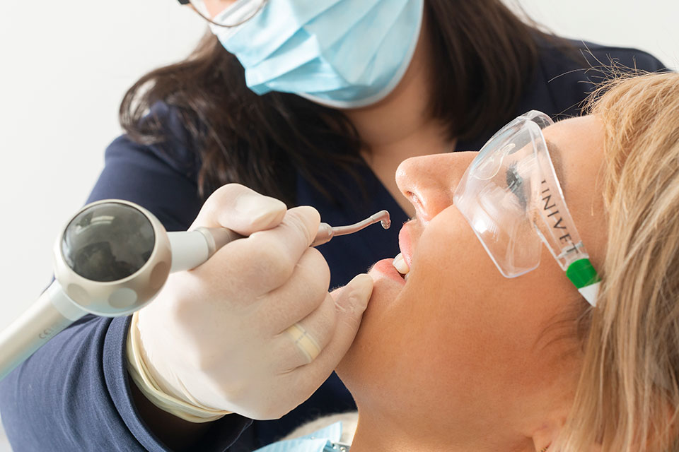 - Im abschließenden Qualitätscheck wird überprüft, ob der Biofilm komplett entfernt wurde. Zum Schutz vor einem erneuten Säureangriff wird der Zahnschmelz fluoridiert.